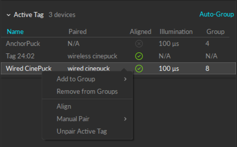 Tags recognized by Motive are listed in the Devices pane under the Active Tag section. Please see the section above for context menu options for this pane.