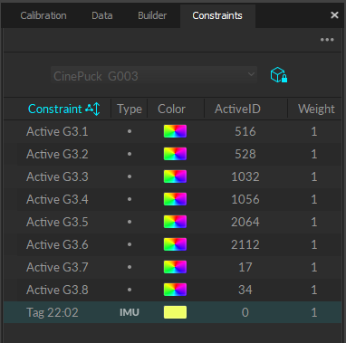 After pairing a Rigid Body to an IMU Puck, an IMU Constraint with IMU information is created for the Rigid Body. The pairing process will also update the Constraint names based on the Puck type identified by Motive.