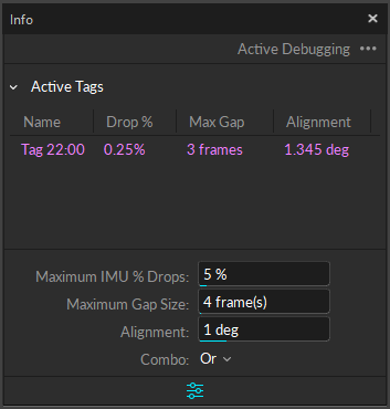 The Active Debugging tool on the Info pane is a troubleshooting aid for active devices. IMU status information is displayed in gray text when it falls within the user-established parameters set at the bottom of the pane. Magenta text indicates that values exceed the parameters.
