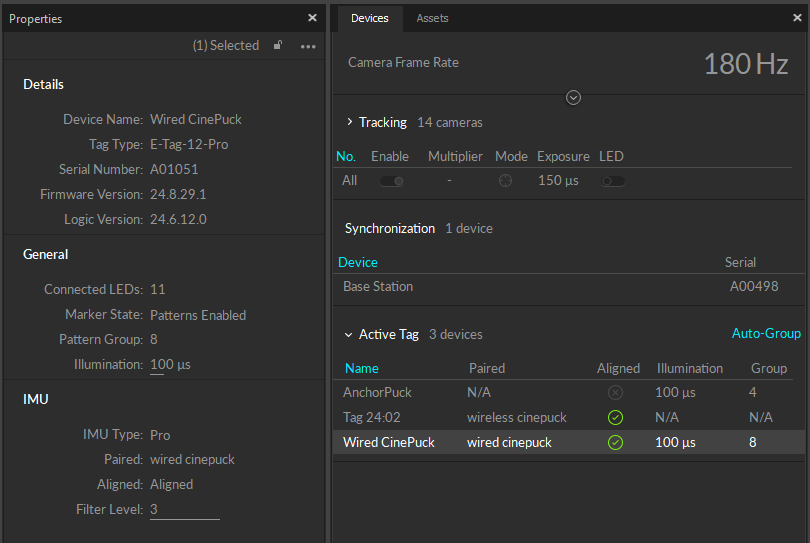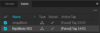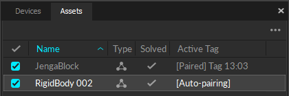When an Asset is paired to the Active Tag, this column displays the associated Rigid Body name, as shown in the Assets pane.