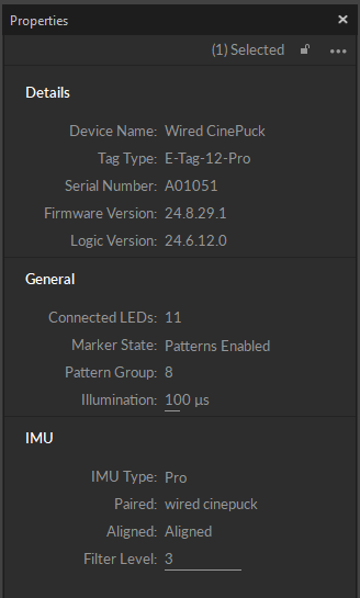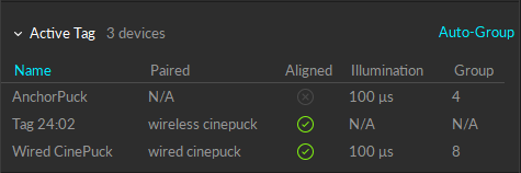 The Name identifies the type of tag, i.e., AnchorPuck, Wired CinePuck. For wireless devices, the Name is set to Tag ##:##, where the first set of numbers indicates the RF Channel and the second the Uplink ID. For example, Tag 22:02 is on RF Channel 22 and has an Uplink ID of 2.