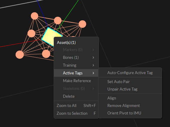 Manually align the Tag to the Rigid Body after pairing. A minimum of 10 alignment samples are required; see the IMU label in the Viewport for the total number of samples currently collected.