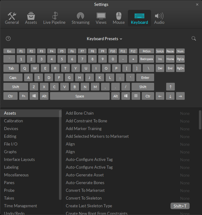 Hotkeys speed up workflows. See all the defaults on the Motive Hotkeys page. To create custom hotkeys, save or import a keyboard preset, click the