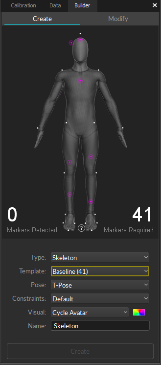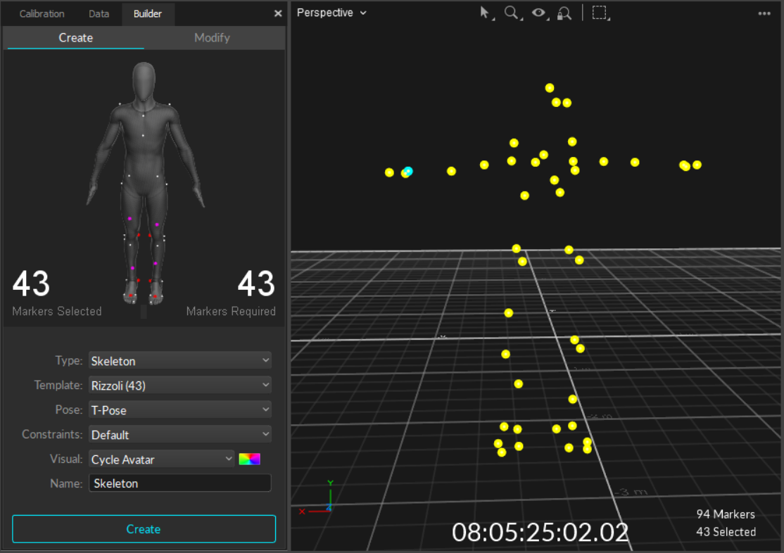 In the Builder pane, the number of Markers Needed and Markers Detected must match. If the Skeleton markers are not automatically detected, manually select the Skeleton markers from the 3D perspective view.