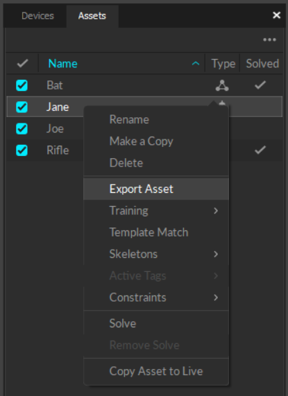 Assets can be exported into the Motive user profile (.MOTIVE file) if they need to be re-imported. The user profile is a text-readable file that contains various configuration settings in Motive, including the asset definitions.