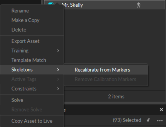 Skeleton assets can be recalibrated using the existing Skeleton information. Recalibration recreates the selected Skeleton using the same Skeleton Marker Set and refreshes expected marker locations on the assets.