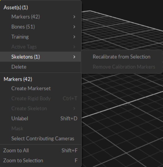 Select all of the associated Skeleton markers in the 3D Viewport, right-click and select Skeleton (1) --> Recalibrate from Selection.
