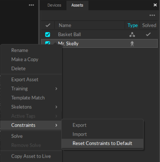 To export a Skeleton XML file, right-click on a Skeleton asset under the Assets pane and select Constraints --> Export Constraints to export corresponding Skeleton marker XML file.