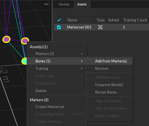 A bone made from 3+ markers will track with 6 Degrees of Freedom (DoF). Use this type of bone for end effectors and generally whenever possible.
