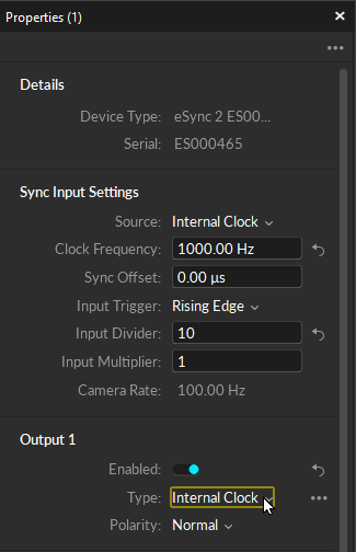 In Motive 3.0 and above, you can quickly configure eSync into biomech sync settings by right-clicking on the eSync from the Devices pane and select one of the presets from the context menu. This will enable and set all of the eSync outputs to the Internal Clock and set the clock frequency.