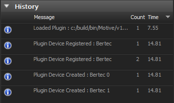 If the hardware and software for the force plates are configured and successfully recognized, Motive will list out the detected force plates with number labels (1, 2, etc..). Motive will notify you of incorrect or nonexistent force plate calibration files. When the devices are successfully instantiated in Motive, the Log pane will indicate that the device has been created and loaded.