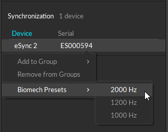 3. [Motive: Devices pane]: Right click the eSync 2 in the Devices pane and choose one of the "Biomech Presets".