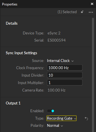 When this is set to Internal Clock, the camera system will reference the clock signal from the eSync 2 to determine the system frame rate. You will be able to configure the clock frequency and apply dividers and multipliers as necessary under the eSync 2 properties.