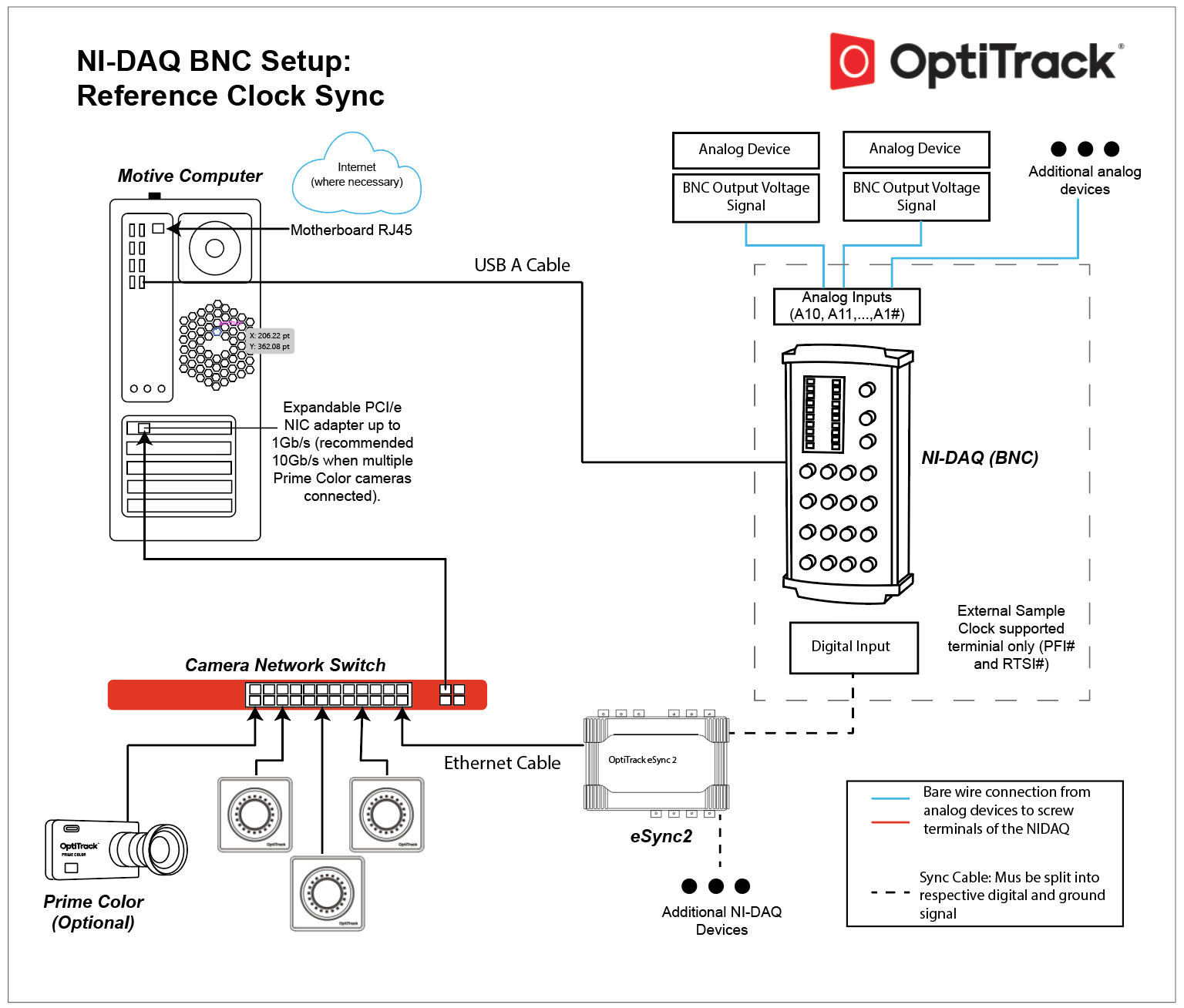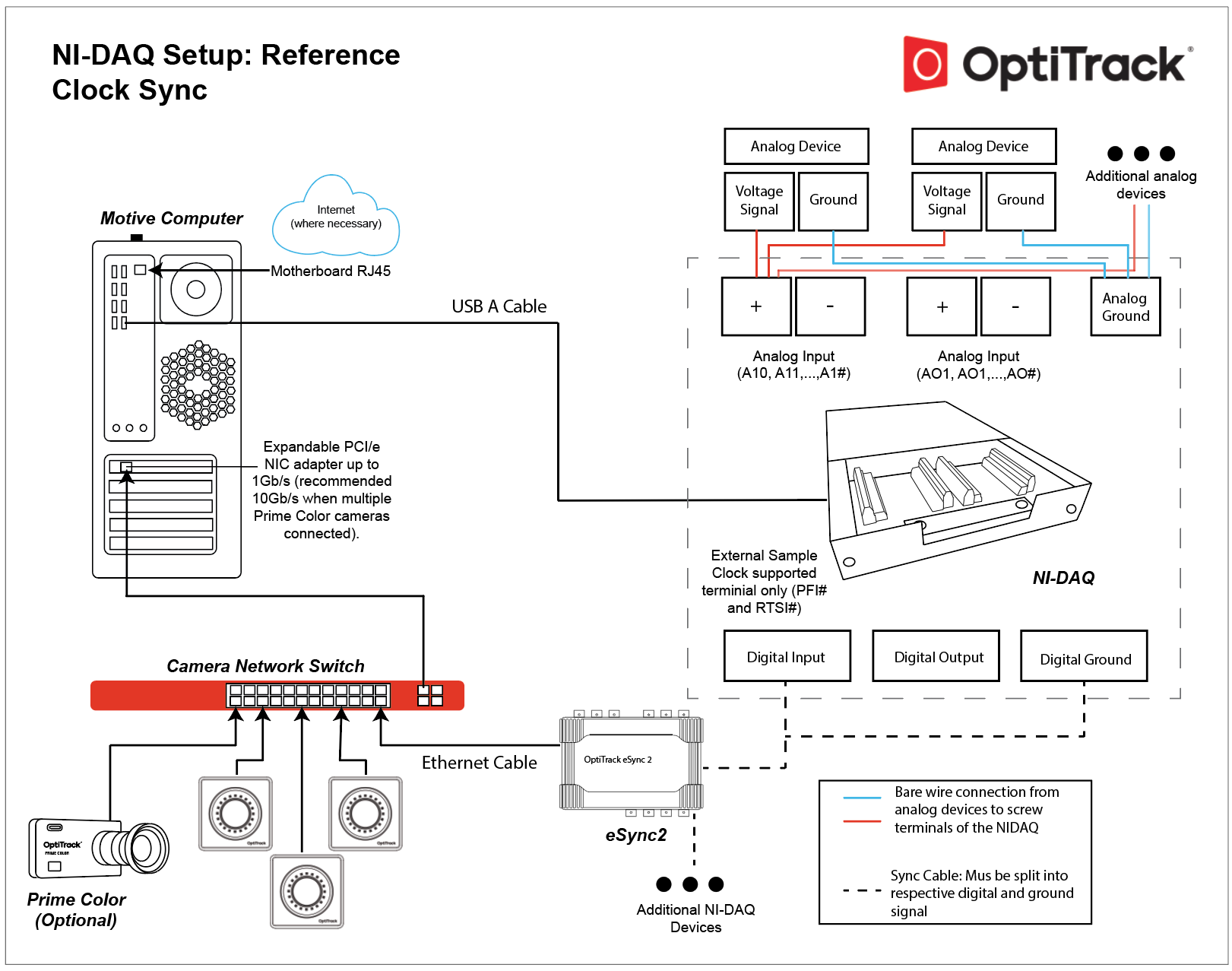 OptiTrack mocap systems use the eSync 2 to provide highly accurate synchronization. When synchronizing the NI-DAQ device through an external clock signal or the reference clock signal, the eSync 2 generates and outputs clock signal to the NI-DAQ device(s), so that it can be used as the master reference clock that the connected devices can synchronize to. This approach is referred to as the reference clock sync, and in this approach, the data samples collected from two systems will be aligned on a per frame basis.