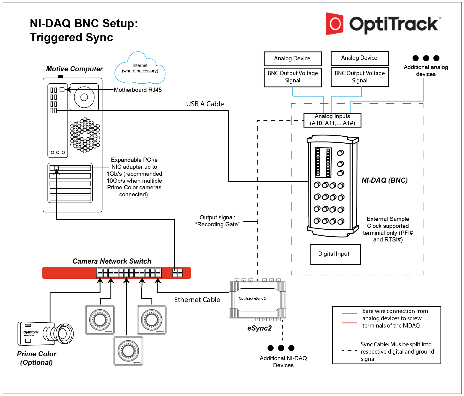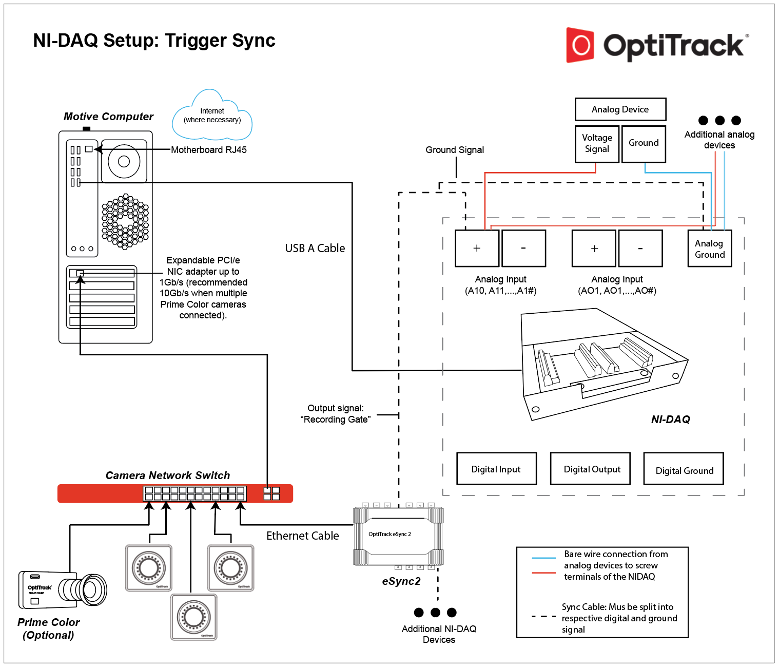 OptiHub 2: Precise synchronization with a USB camera system is NOT supported. An Ethernet camera system with the eSync 2 synchronization hub should be used for NI-DAQ integrations. It is possible for the USB camera system to roughly synchronize to a NI-DAQ device via triggered sync, however, there will always be a variable time delay between the trigger and when the cameras start exposing. Due to this variable offset, the two of the recorded datasets cannot be perfectly aligned at the start of recording.