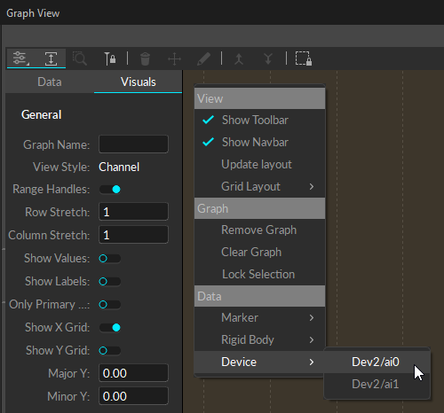 First, make sure the NI-DAQ device and its operating analog input channels are enabled under the Devices pane. Then, open the Graph pane and create a custom layout for monitoring live-analog data; create a new layout, right-click on the graphs, and select the device channel you wish to plot. Then, open the graph editor (
