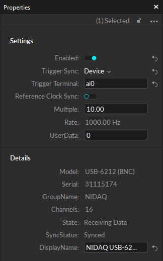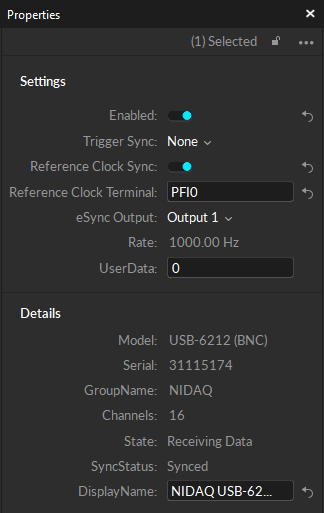 9. [Motive: Properties pane (NI-DAQ)] Within the NI-DAQ device property, set the Reference Clock Sync to True. At this point, the sampling rate of the NI-DAQ device in the Device Panel should be set to the same frequency as the internal clock signal configured for the eSync 2.