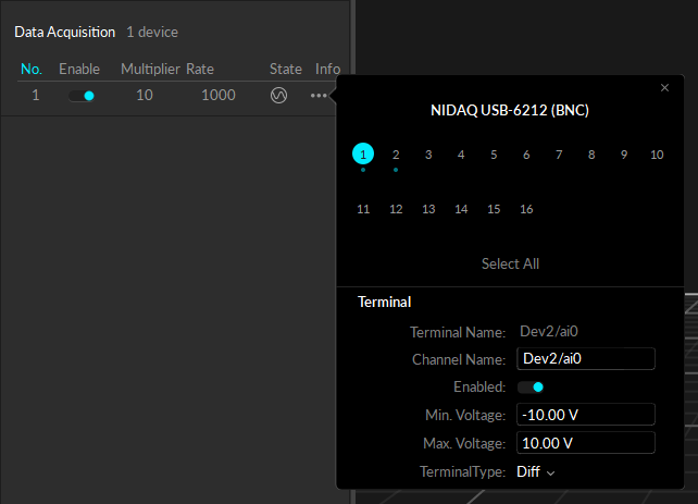 Motive will report all terminals detected through the device. Some BNC NI-DAQ models wrap two RSE terminals into each BNC Diff terminals (e.g. USB-6212: 16 RSE terminals into 8 Diff terminals), and it will report all RSE terminals into Motive. This means the actual number of channels reported in Motive may be more than the actual number of Diff terminals on the device. In this case, there will be an error message when attempting to enable channels that are not available. Please be aware of the device specification and enable only the Diff channels that are available on the device.