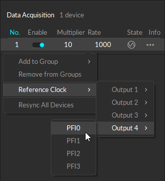 4. [Motive: Devices pane] Right click the eSync 2 in the Devices pane, hover over the "Reference Clock" option, hover over the eSync 2 Output # used in step 1, then choose the corresponding DAQ PFI #.
