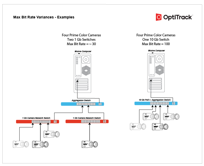 To determine the ideal bit rate for your camera system, it's important to also consider the network configuration. Once you've calculated the ideal bit rate for the cameras, you can use that value to determine how many Prime Color cameras you can attach to each 1 Gb child switch and the total number of cameras the 10 Gb aggregator will handle.