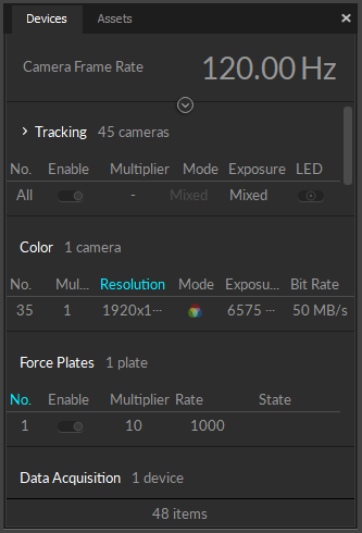 Listed in their own category in the Devices pane, Prime Color Cameras are configured in the same manner as other OptiTrack tracking cameras.