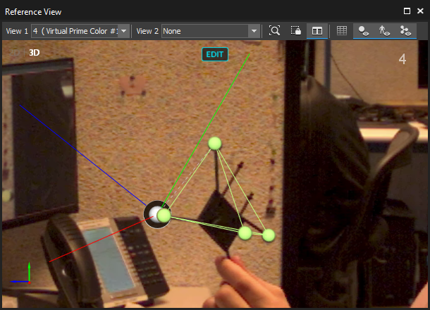 The Prime Color FS is equipped with a filter switcher that allows the cameras to detect in IR spectrum. The Prime Color FS can be calibrated into the 3D capture volume using an active calibration wand with the IR LEDs. Once calibrated, the color camera will be placed within the 3D viewport along with other tracking cameras, and 3D assets (markers, Rigid Bodies, Skeletons, cameras) can be overlaid as shown in the image.