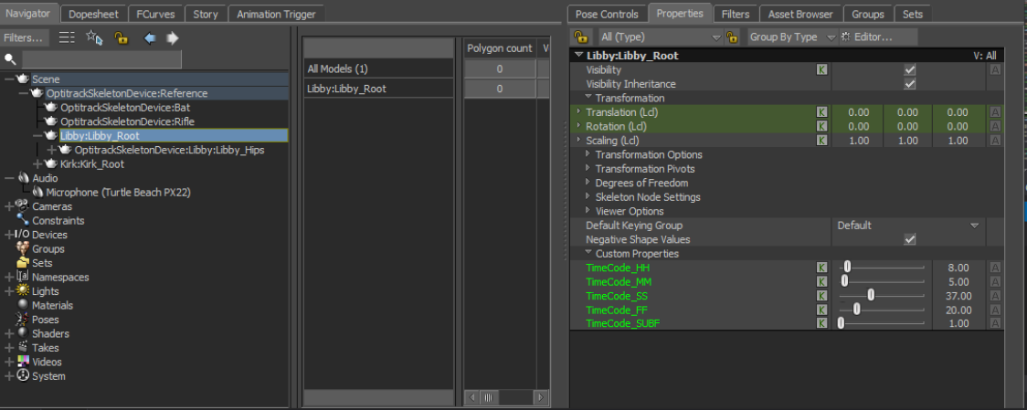 In addition to timecode on each device, the Skeleton device also writes timecode onto each Skeleton asset root as an animatable user property. This allows you to export that asset only, while keeping the original timecode.