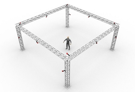 Optical motion capture systems utilize multiple 2D images from each camera to compute, or reconstruct, corresponding 3D coordinates. For best tracking results, cameras must be placed so that each of them captures unique vantage of the target capture area. Place the cameras circumnavigating around the capture volume, as shown in the example below, so that markers in the volume will be visible by at least two cameras at all times. Mount cameras securely onto stable structures (e.g. truss system) so that they don't move throughout the capture. When using tripods or camera stands, ensure that they are placed in stable positions. After placing cameras, aim the cameras so that their views overlap around the region where most of the capture will take place. Any significant camera movement after system calibration may require re-calibration. Cable strain-relief should be used at the camera end of camera cables to prevent potential damage to the camera.