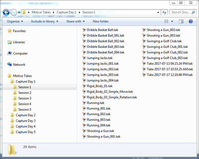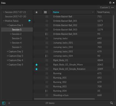 Each capture recording will be saved in a Take (TAK) file and related Take files can be organized in session folders. Start your capture by first creating a new Session folder. Create a new folder in the desired directory of the host computer and load the folder onto the Data pane by either clicking on the