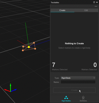 To define a Rigid Body, simply select three or more markers in the Perspective View, right-click, and select Rigid Body → Create Rigid Body From Selected. You can also utilize CTRL+T hotkey for creating Rigid Body assets. You can also use the Builder pane to define the Rigid Body.
