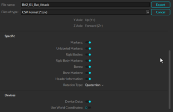Motive exports reconstructed 3D tracking data in various file formats, and exported files can be imported into other pipelines to further utilize capture data. Supported formats include CSV and C3D for Motive: Tracker, and additionally, FBX, BVH, and TRC for Motive: Body. To export tracking data, select a Take to export and open the export dialog window, which can be accessed from File → Export Tracking Data or right-click on a Take → Export Tracking data from the Data pane. Multiple Takes can be selected and exported from Motive or by using the Motive Batch Processor. From the export dialog window the frame rate, measurement scale, and frame range of exported data can be configured. Frame ranges can also be specified by selecting a frame range in the Graph View pane before exporting a file. In the export dialog window, corresponding export options are available for each file format.