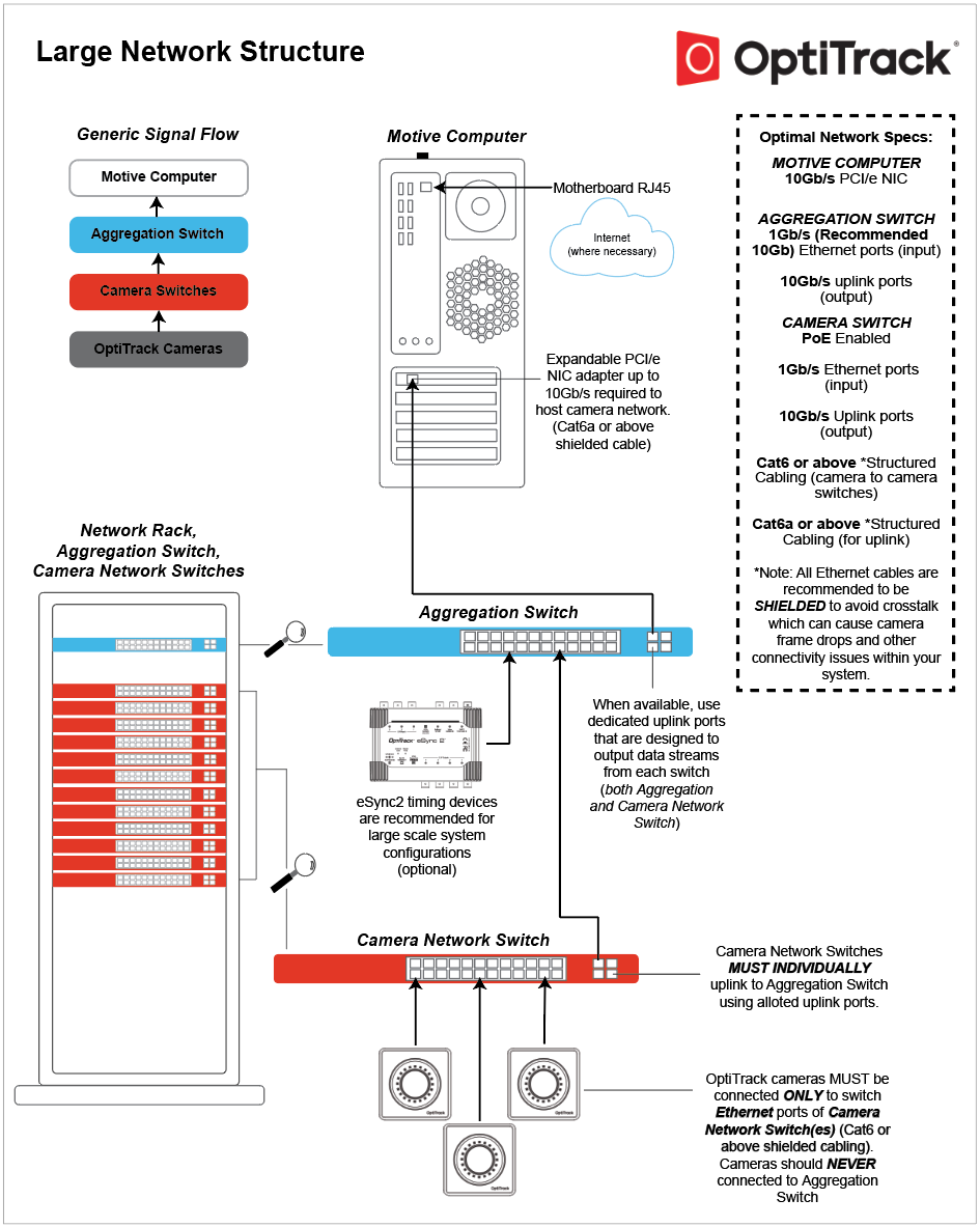 High Camera Counts: For setting up more than 24 Prime series cameras, we recommend using a 10 Gigabit uplink switch and connecting it to the host PC via an Ethernet cable that supports 10 Gigabit transfer rate — Cat6a or above. This will provide larger data bandwidth and reduce the data transfer latency.