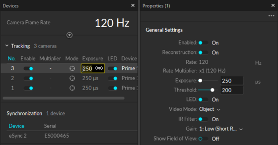 Connected cameras will be listed under the Devices pane. This panel is where we can configure settings (FPS, exposure, LED, and etc.) for each camera and decide whether to use selected cameras for 3D tracking