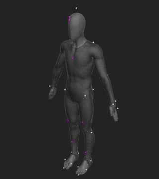 Place the retro-reflective markers onto subjects (Rigid Body or Skeleton) that you wish to track. Double-check that the markers are attached securely. For skeleton tracking, open the Builder pane, go to skeleton creation options, and choose a marker set you wish to use. Follow the skeleton avatar diagram for placing the markers. If you are using a mocap suit, make sure that the suit fits as tightly as possible. Motive derives the position of each body segment from related markers that you place on the suit. Accordingly, it is important to prevent the shifting of markers as much as possible. Sample marker placements are shown below.