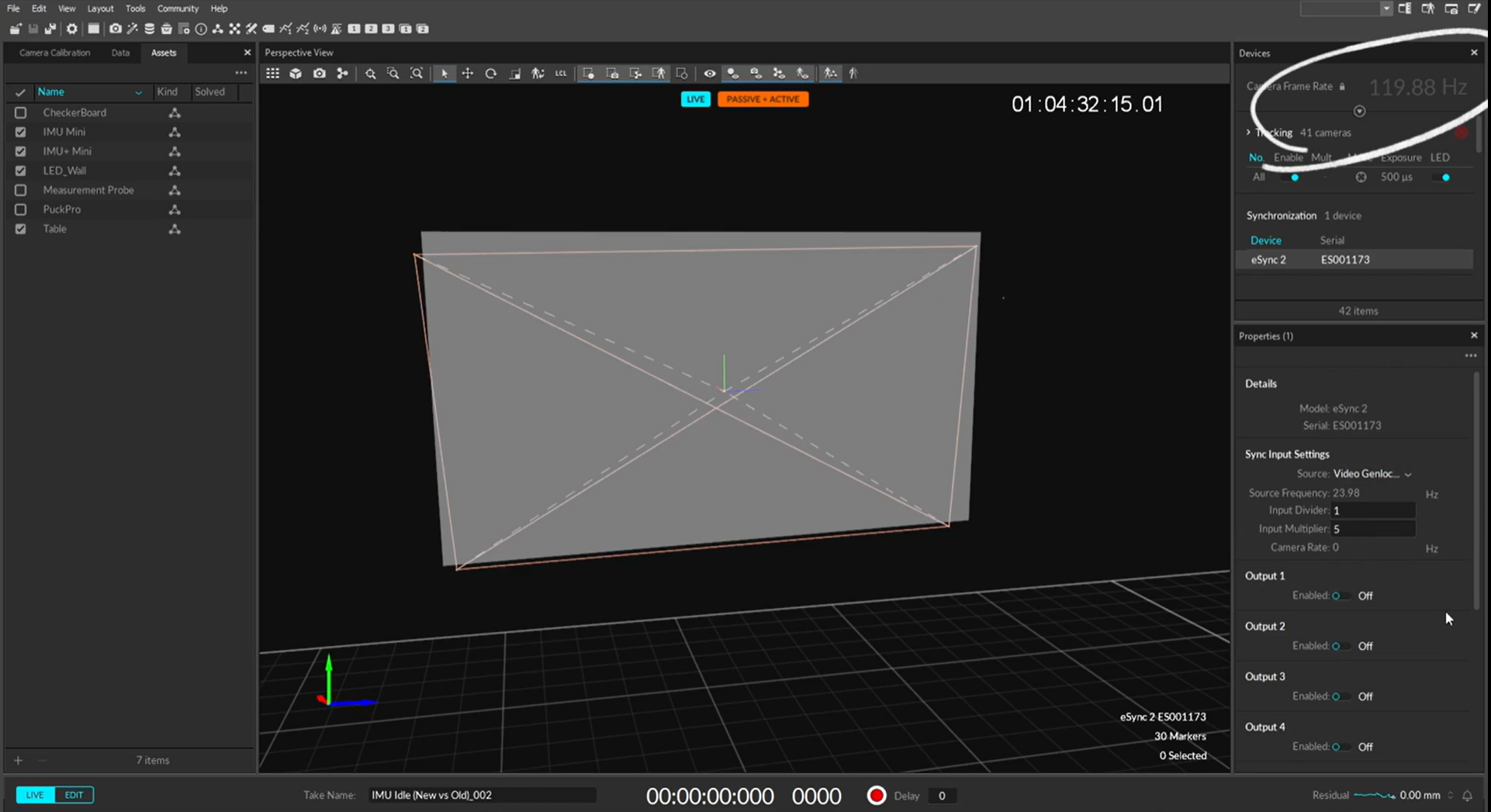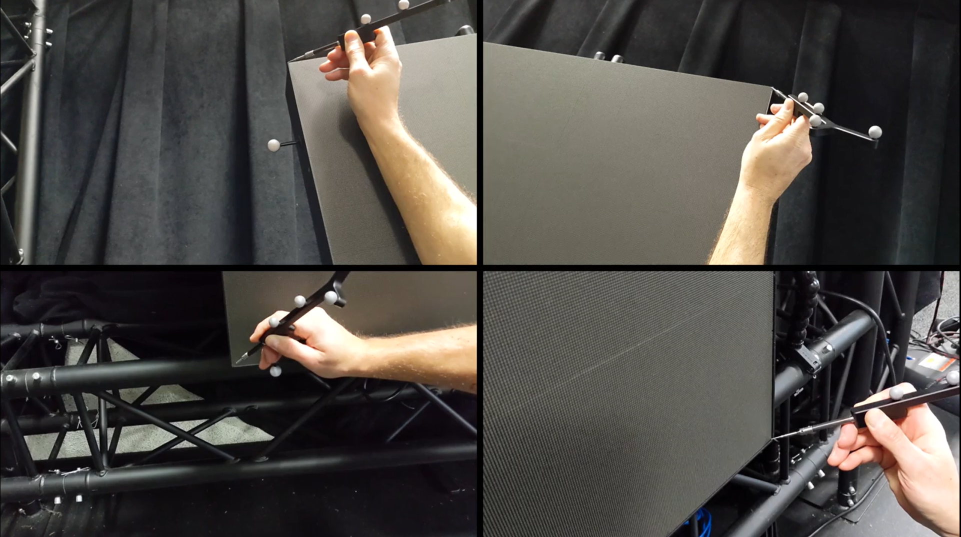 The OptiTrack system is used to track the camera, calibration checkerboard, (optional) LED Wall, and (optional) any other props or additional cameras. As far as OptiTrack hardware is concerned, you will need all of the typical hardware for a motion capture system plus an eSync2, BaseStation, CinePuck, Probe, and a few extra markers. Please refer to the Quick Start Guide for instructions on how to do this.