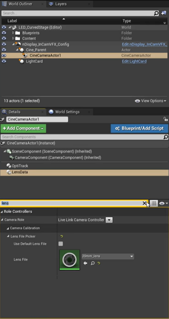 For our setup we have labeled one live link controller “Lens” and the other “OptiTrack”.