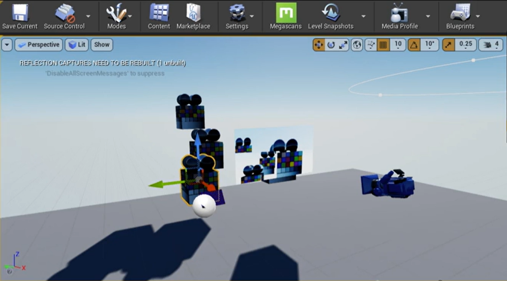 The next step would be to add whatever reference scene you want to use for your LED Wall Virtual Production shoot. For example, we just duplicated a few of the color calibrators (see image to the right) included with the sample project, so that we have some objects to visualize in the scene.