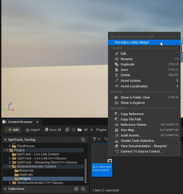 To view the Skeletal Mesh Generator widget, right click on the BLU_SkelmeshFromLiveLink and select Run Editor Utility Widget.