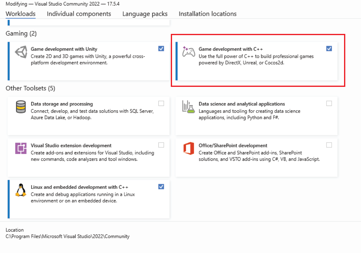 During installation, from the Workloads tab make sure to select 'Game Development with C++'