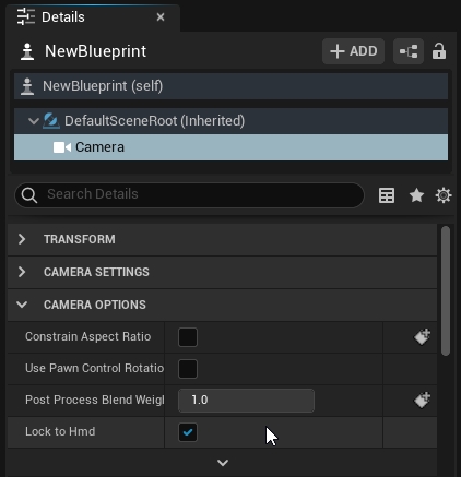 (optional) Double-check that the “Lock to HMD” property is set to true under the camera component properties in the details pane.
