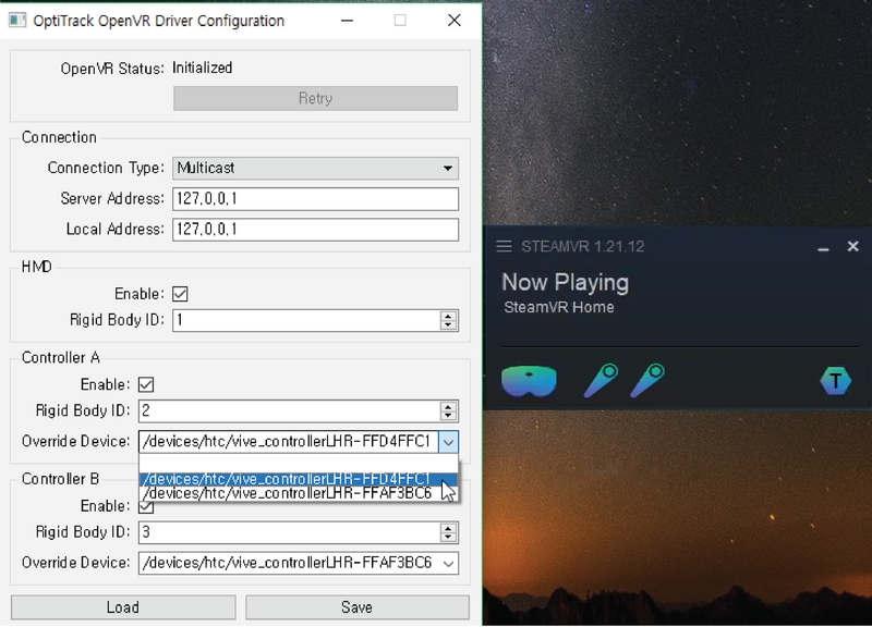 Once the driver has been successfully installed, launch the configuration utility software (C:\Program Files\OptiTrack\OpenVR Driver\ConfigUtil). Using this tool, you can load and check existing configurations and make changes to the settings as needed. To import current settings, click Load and to save out the changes, click Save.