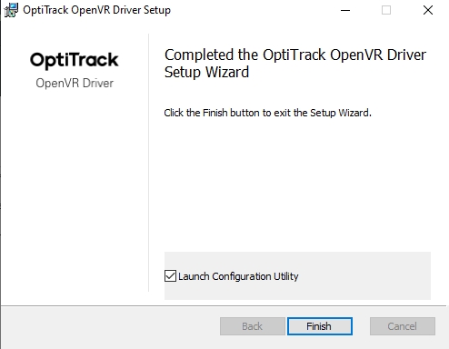 Download the OpenVR driver from the downloads page. Once downloaded, launch the installer and follow the prompts to set up the driver. On the last window, make sure to select Launch Configuration Utility before clicking Finish. This will open the Configuration options to setup your HMD with Motive.