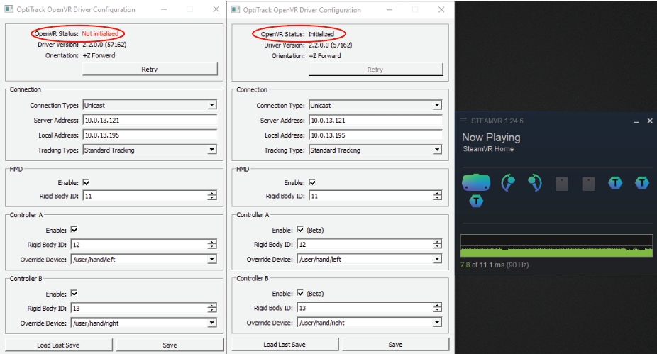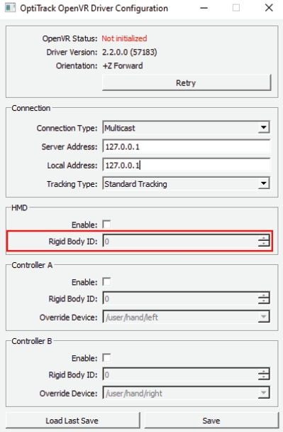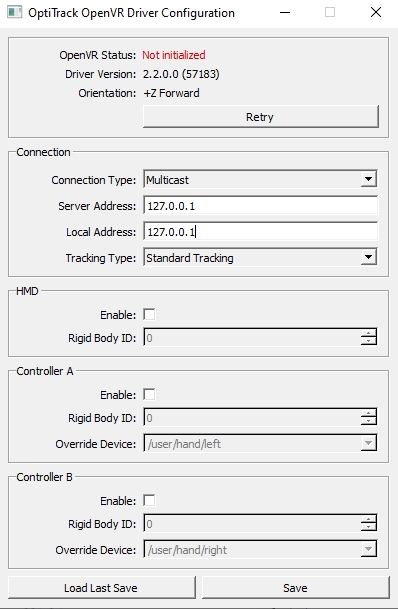 Once the driver has been successfully installed, launch the configuration utility software (C:\Program Files\OptiTrack\OpenVR Driver\ConfigUtil). Using this tool, you can load and check existing configurations and make changes to the settings as needed. To import current settings, click Load and to save out the changes, click Save.